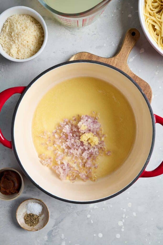 - Sauté aromatics: In the same pot, melt butter over medium-low heat. Add shallots and garlic. Cook 2-3 minutes until softened but not browned.