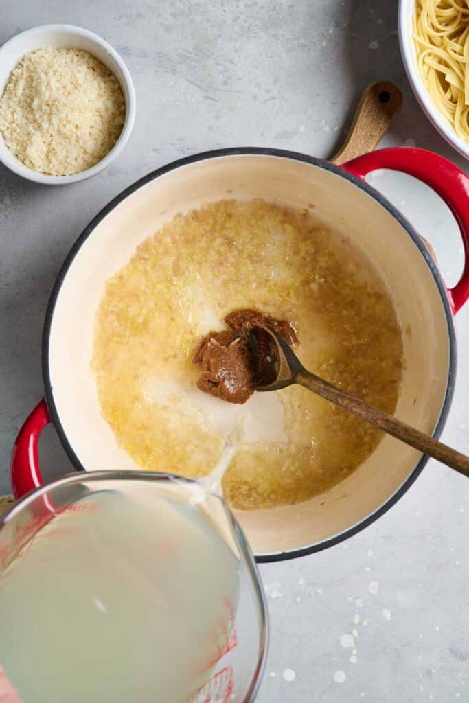 - Add the miso paste and pour in about 1 cup of the hot pasta cooking water (it doesn’t have to be exact, you just want to reserve a bit of the water to add after the pasta is added), whisking constantly to dissolve the miso.